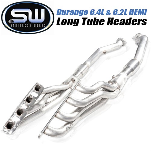 Improve the sound and performance on your Durango with premium headers from Stainless Works. American-Made and designed for the 2018-24 Dodge Durango SRT 6.4L and 6.2L, these headers feature 1-7/8" primary tubes that are CNC mandrel bent to increase air flow, and engineered to create power. These headers come with 3" slip-fit collectors, as well as high-flow catalytic converters that flow into 3" lead pipes, merging into a flanged leads to allow an easy connection to your Factory exhaust or Stainless Works exhaust.